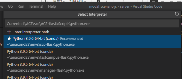 나의 파이썬 프로젝트 폴더를 vs코드로 연뒤에 터미널창 하단에 보면 환경설정하는 탭이있다. 없다면 extensions에 python을 설치해야함