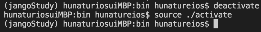맥의경우 만들어진 가상환경폴더>bin에 이동한뒤 source ./activate입력후 엔터하면 가상환경에 진입한다.