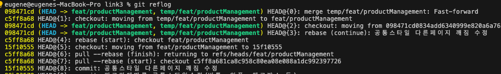 git에서 로컬저장소의 모든 HEAD 변경이력을 보여준다. 일반적으로 git log는 브랜치의 커밋히스토리만 보여주지만,